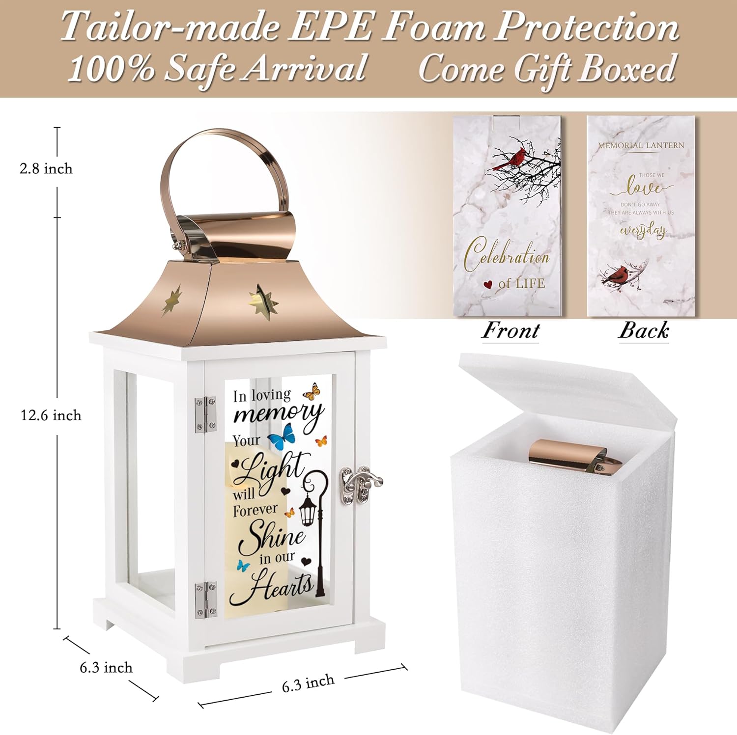 - Sympathy Gift-Well Packaged to Gifts: The sympathy lantern comes with an original designed gift box with inspirational words "celebration of life" & "those we love don't go away"&"always near". It's also protected by tailor-made EPE foam to make sure nothing is broken.This is a valued memorial gift that will be cherished for years to come.
