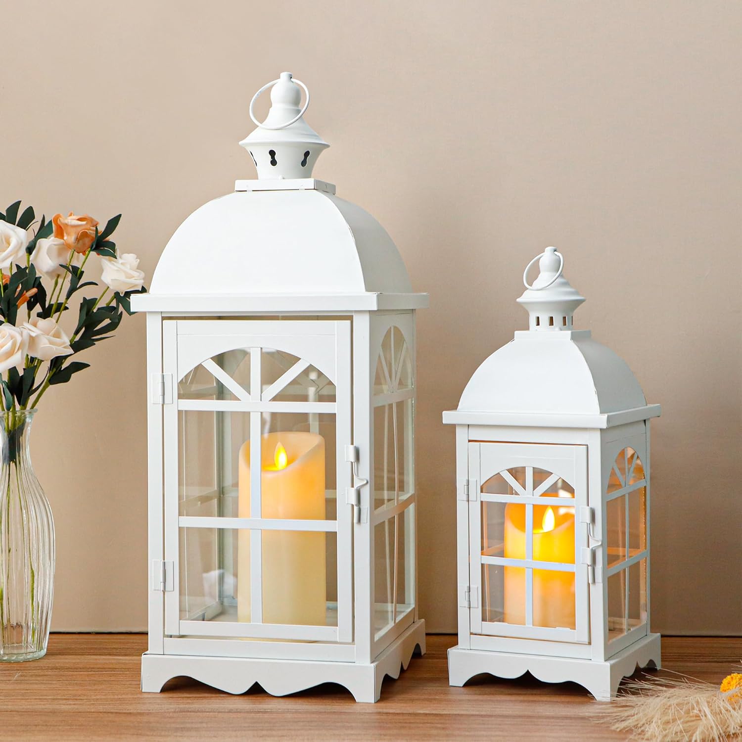 TRIROCKS Set of 2 Decorative Vintage Candle Lanterns 14.5"&20" H Farmhouse Outdoor Hanging Lanterns with Tempered Glass for Porch, Balcony, Patio, Home, Centerpieces, Indoor, Outdoor(White)